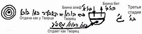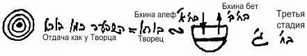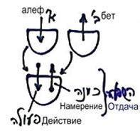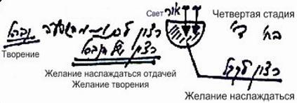 Почему каббалисты прибегают к обозначениям на основе букв алфавита? Продолжив изучать развитие реальности, мы узнаем следующее (см. рисунок справа). Буква йуд означает наслаждение, наполняющее сосуд и ощущающееся в первоначальном желании. Буква хэй обозначает свойство отдачи. Буква вав символизирует действие по отдаче в третьей стадии со стороны второй стадии, т.е. развитие отдачи (стрелка вниз). И, наконец, последняя хэй, которая соответствует четвертой стадии и подобна первой букве хэй, символизирующей Бину, говорит о том, что в итоге четвертая стадия принимает форму второй и тем самым достигает уподобления свойств Дающему, т.е. корневой стадии, кончику буквы йуд.