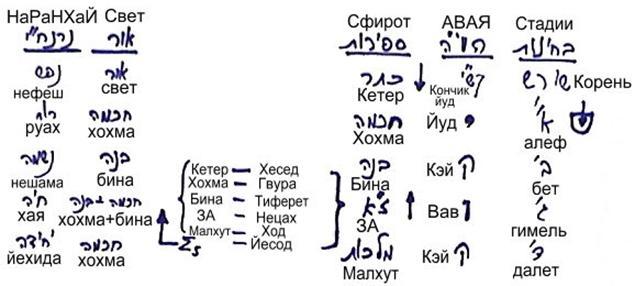 Темой сегодняшнего урока были четыре стадии распространения прямого света. Вся реальность, которую мы будем изучать в дальнейшем, является результатом этих фаз: кончик буквы йуд – сама йуд – первая хэй – вав – и последняя хэй. Иначе говоря, речь идет о десяти сфирот: Кетер (К), Хохма (Х), Бина (Б), Зеир Анпин (ЗА) и Малхут (М). Деление по светам внутри этих сфирот следующее: нефеш - руах - нешама - хая - йехида.