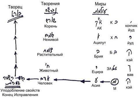 А потому мы всегда можем сказать, что творение включает в себя четыре ступени развития : корневую (шореш), первую, вторую, третью и четвертую (алеф, бет, гимель, далет – по первым буквам еврейского алфавита). Также мы обозначаем их буквами: йуд-кэй-вав-кэй, составляющими имя АВАЯ (вместо «hэй» мы говорим «кэй», чтобы не акцентироваться на точном произношении букв, обозначающих те или иные духовные силы). Корневой стадии соответствует кончик буквы йуд.
