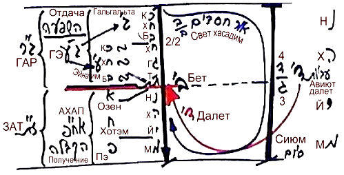 Когда влияние бхины далет, большое желание, авиют четвертой степени достигает Бины (красная стрелка на чертеже) – он воздействует на АХАП, т.е. не на отдающую, а на получающую часть парцуфа. Часть эта буквально изолируется, и к ней добавляется желание наслаждений бхины далет с авиютом четвертой степени. Таким образом, в АХАПе, т.е. в НеХИМ дэ-Бина воцаряется очень большое желание наслаждений.