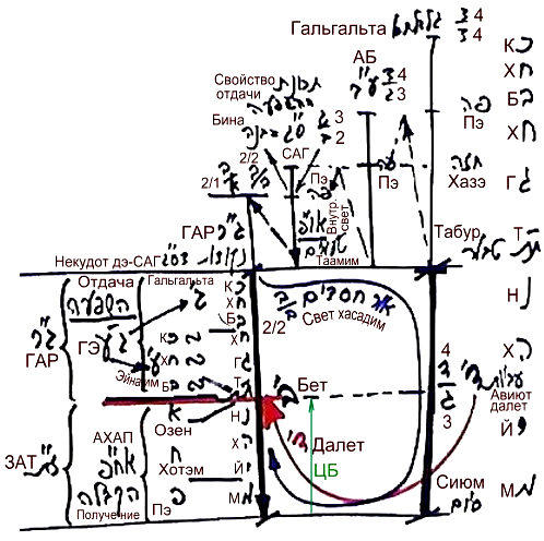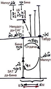 Однако затем парцуф САГ утончается по обычной схеме, вследствие соударения внутреннего и окружающего света. В результате, он обретает решимот на бет дэ-итлабшут и бет дэ-авиют (2/2), что означает чистую Бину. Тогда-то парцуф этот и оказывается способным распространиться как над табуром, так и под ним. Ведь он весь состоит из света хасадим. Распространяясь под табур, САГ к тому же наполняет сосуды НеХИ, принадлежащие Гальгальте, своим светом, светом хасадим, параметры которого: бет дэ-итлабшут на бет дэ-авиют (2/2).