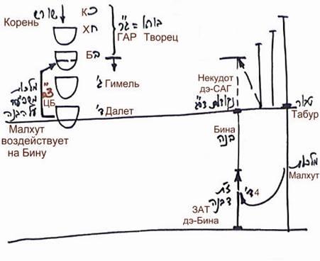 Итак, верхняя часть бхины бет приходит к желанию отдавать, а нижняя ее часть планирует действие по отдаче. Верхняя часть Бины называется ГАР ( гимель ришонот) – три верхних сфирот, а нижняя часть называется ЗАТ ( заин тахтонот) – семь нижних сфирот.