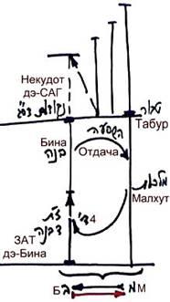 Ну а на данном этапе пока незаметно, чтобы Бина давала Малхут такой свет, благодаря которому та смогла бы исправиться. Здесь, под табуром, Малхут может лишь получать впечатления от отдачи Бины, однако, в конечном счете, соединившись с Биной, Малхут наложила на нее сокращение. В результате, меж ними образовалась особого рода спайка, и теперь они могут взаимодействовать друг с другом. Пока что Малхут воздействует на Бину Вторым сокращением, но потом, когда Малхут обретет исправления, она обяжет Бину дать ей в ответ те света, которые на данный момент отказывается принимать.
