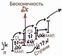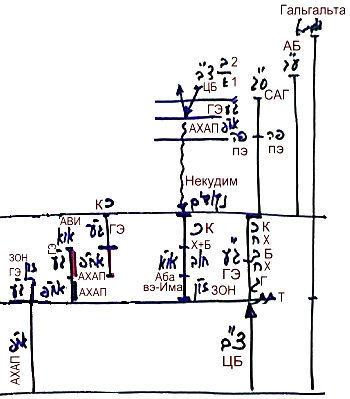 Если взять Кетер и отделить в нем работающие части от неработающих, то обозначится следующая картина. Кетер разделен на ГЭ и АХАП, причем действие производится лишь Гальгальтой вэ-Эйнаим. Та же картина наблюдается и в Аба вэ-Има, где тоже работает лишь Гальгальта вэ-Эйнаим, а АХАП бездействует. ЗОН также укладывается в эту схему. Я специально графически разделил общий парцуф на отдельные части, чтобы показать, как необычно он устроен: нижняя часть каждого высшего парцуфа находится в верхней части низшего парцуфа.