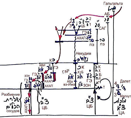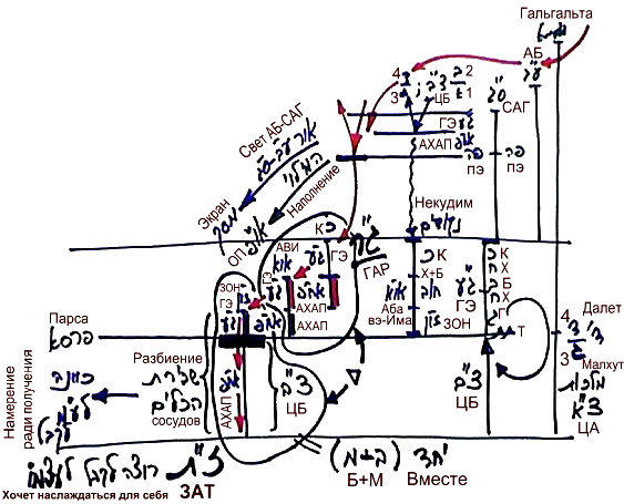 Тогда в парцуфе САГ производится сочетание на решимот 4/3. Сочетание это совершается на весь парцуф САГ, на уровне пэ, и, как следствие, свет распространяется (см. красные стрелки на чертеже) в Кетер,из Кетера – в Аба вэ-Има, а из АВИ – в ЗОН. Здесь из Гальгальты вэ-Эйнаим дэ-ЗОН он через парсу проходит в АХАП дэ-ЗОН.