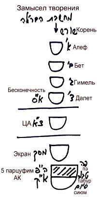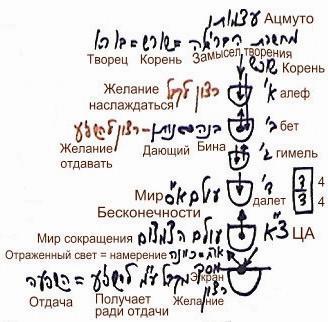 Как мы сказали, существует замысел творения о наслаждении созданий Творца. Замысел этот является корнем (шореш) всему. Относительно нас – это Творец. Ему предшествует Ацмуто – непостижимая сущность Творца, исследовать которую мы не можем.