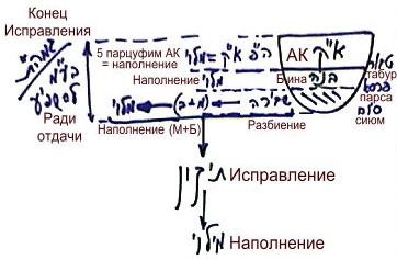 Что из этого следует? Благодаря пяти парцуфим мира АК, есть наполнение (милуй) в верхней части. Благодаря Бине, спустившейся под табур, есть наполнение также в части, лежащей между табуром и парсой. Недостает наполнения лишь в тех сосудах, которые разбиты. Однако вследствие их разбиения Малхут и Бина соединяются друг с другом. Теперь, если путем тех или иных действий привести к тому, что Бина исправит собственными первоначальными свойствами сперва себя, а затем Малхут, на намерение ради отдачи – тогда, безусловно, можно достичь наполнения оставшейся части Малхут. Так мы достигнем, в итоге, Конца Исправления (Гмар Тикун), когда вся Малхут Бесконечности целиком обретет намерение ради отдачи.