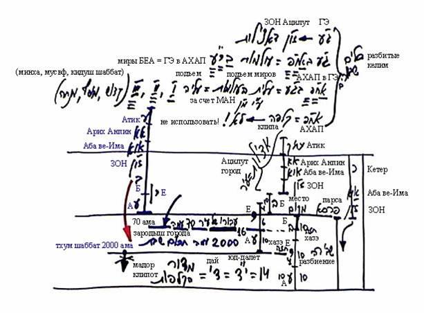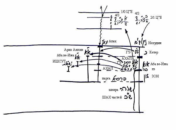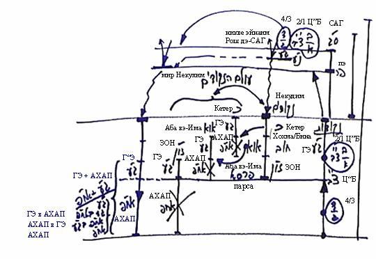 Предположим, в Кетер есть 10 сфирот, но он работает только в своей Гальгальта-Эйнаим, а его АХАП не работает. В Аба вэ-Има есть 10 сфирот, но действуют только их Гальгальта-Эйнаим, а АХАП парцуфа Аба вэ-Има не действует. То же самое – парцуф ЗОН. В нем работает Гальгальта-Эйнаим, а его АХАП, находящийся под парсой, не работает, поэтому мы его вообще не рисуем, так как он находится под Сокращением.