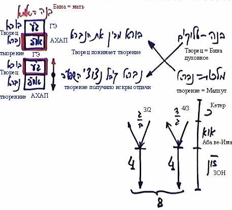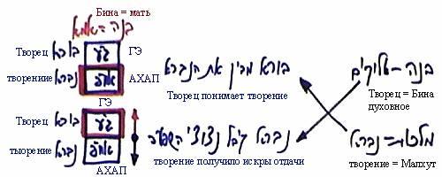 Это означает, что теперь в Бине (Биной называется Творец, духовное) есть ее Гальгальта-Эйнаим и АХАП, и в творении тоже есть Гальгальта-Эйнаим и АХАП. В Бине Гальгальта-Эйнаим – это Творец, а ее АХАП – это часть творения. В творении Гальгальта-Эйнаим представляет собой часть Творца, а его АХАП – это творение внутри него.