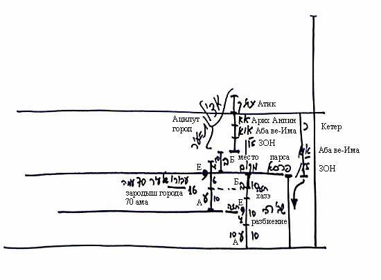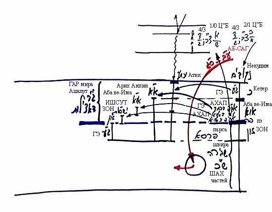 Но когда создавались сами миры, они были созданы в более высоком состоянии, на более высоком месте. Сфирот этих миров расположились следующим образом: 10 сфирот мира Брия, 4 сфиры мира Ецира выше парсы и 6 сфирот ниже парсы до хазэ мира Брия, затем еще 10 сфирот от хазэ мира Брия до хазэ мира Ецира. В итоге 16 сфирот расположены под парсой выше хазэ мира Ецира, а ниже хазэ мира Ецира находятся 14 сфирот = 4 + 10.