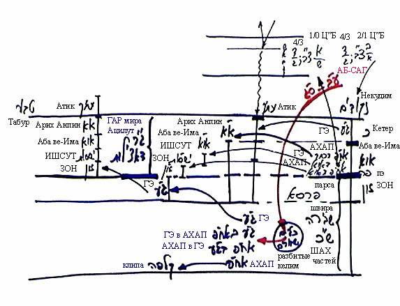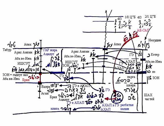 Поэтому вместе с решимот 2/1 поднялось также решимо 4/3, и затем САГ делает на него зивуг. Для того чтобы совершить зивуг на решимо 4/3, САГ опускает свой экран в пэ, потому что решимот 4/3 означают, что необходимо наполнить парцуф светами также внизу, и делает зивуг на весь парцуф. И тогда свет приходит вниз, распространяется во всем парцуфе – и выше, и ниже парсы так, что в Кетер образуются 10 сфирот, в Аба вэ-Има – 10 сфирот, и ЗОН распространяется вниз. Когда келим ЗОН распространяются вниз, они соединяют свои Гальгальта-Эйнаим с АХАП, и тогда все эти келим ЗОН разбиваются, Гальгальта-Эйнаим входит в АХАП, АХАП – в Гальгальта-Эйнаим таким образом, что образуются келим Гальгальта-Эйнаим с АХАП, перемешанные друг с другом на бесконечную глубину.