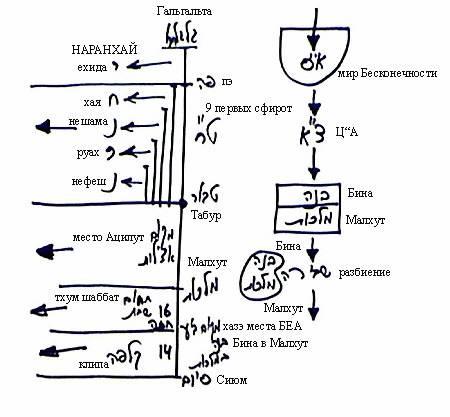 Была Малхут Бесконечности, стадия далет, получившая свет. В результате этого образовался мир Бесконечности. Затем Малхут совершила Сокращение, так как не смогла вынести своей противоположности Творцу. После всех этих действий, совершив Сокращение, она пришла к состоянию, в котором часть ее соединилась с Биной, разбилась, и тогда части Бины вошли внутрь Малхут, смешались вместе и из этого разбиения была построена система парцуфим, спускающихся от Малхут Бесконечности. В этой системе парцуф Гальгальта символизирует Малхут Бесконечности, а после Гальгальты образуется система парцуфим от пэ до табура Гальгальты - АБ, САГ, МА, БОН. Эта система выдает пять светов НАРАНХАЙ согласно авиюту экрана, силе экрана, согласно келим.