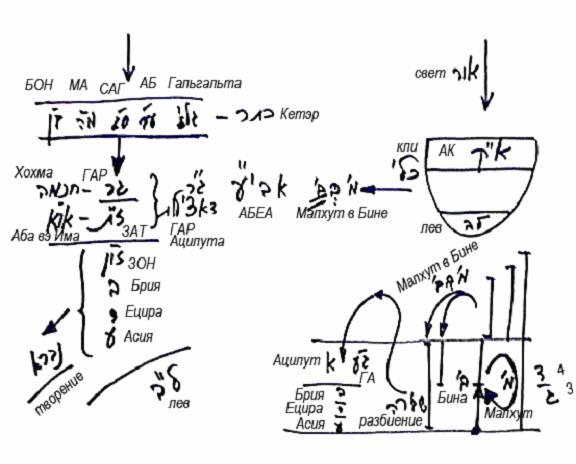 И когда он был в таком состоянии, когда его голова была полностью на уровне бины выше парсы, а реглаим в келим бины, которые находятся ниже парсы, но это келим бины, которые называются ибуро шель ир. В таком состоянии он думал, что уже полностью находится в мире Ацилут, в Ган Эден (Райский Сад) и ему можно есть, то есть можно использовать келим, которые называются его раглин – истинный АХАП. Он использует их, и разбивается. А когда он разбивается, миры опускаются на свои постоянные места – Асия, Ецира, Брия, ЗОН, АБА вэ Има, Арих Анпин, Атик и АК.