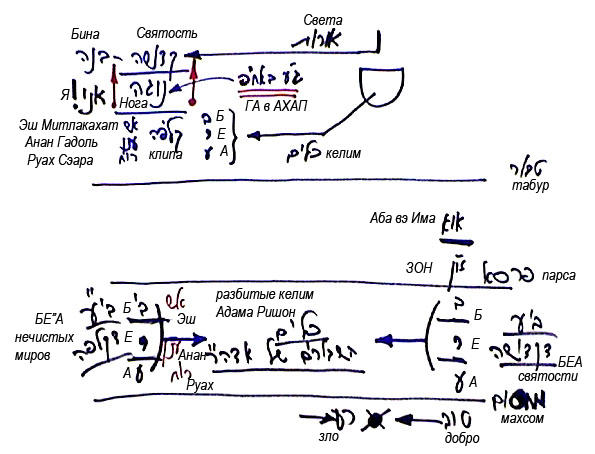 Эти выяснения в клипат Нога в мире Ацилут не кончаются на уровне миров. А происходит спуск на уровень, где на самом деле существует свобода выбора, на уровень таких категорий, где не действует включение ГЭ в АХАП, не действуют чистые и нечистые миры БЕА, когда человеку понятно, где он находится, и он может проводить выяснение в своих разбитых келим. Вся эта система спускается на уровень ниже махсома.