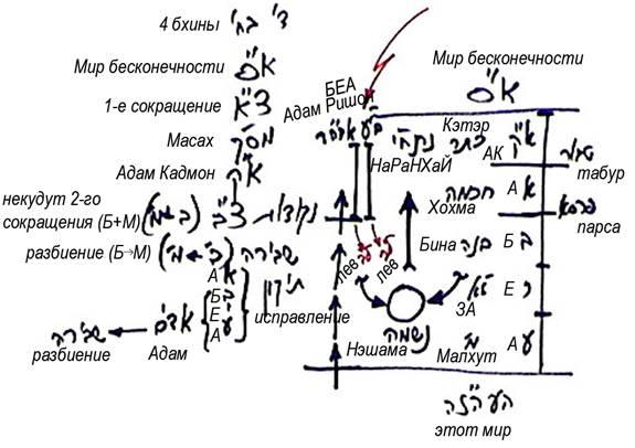 Затем происходит разбиение, бина входит в малхут, происходит их соединение и исправление разбиения. И тогда при исправлении выходят четыре мира – Ацилут, Брия, Ецира, Асия. Внутри этих четырех миров впоследствии родился Адам, который тоже разбился. Исправление происходит в мирах – Асия, Ецира, Брия, Ацилут, АК, и выше – в мире Бесконечности. Этот же мир находится внизу.