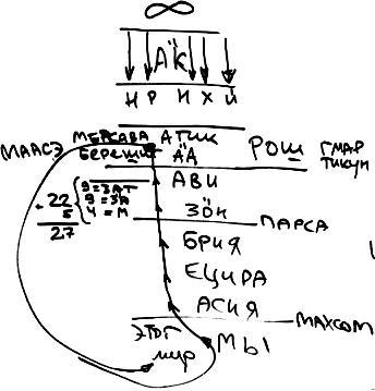 Мы так можем представить себе все творение: мир Бесконечности, затем мир А"К, который преобразует мир Бесконечности в пять ветвей, по которым нисходят нефеш, руах, нешама, хая, ехида, нисходит к нам высшее изобилие, которое затем проходит через Атик, А"А, АВ"И, ЗО"Н, парса, затем Брия, Ецира, Асия, и мы, в нашем первоначальном состоянии – этот мир.