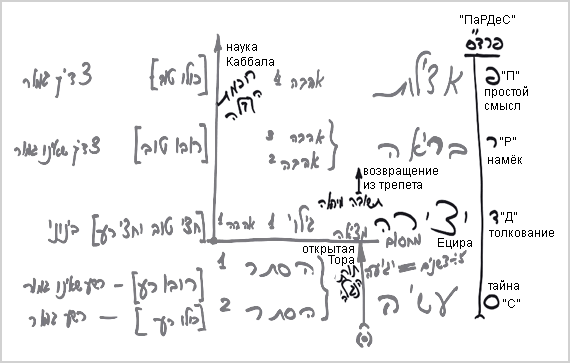 Так о ком можно сказать, что он находится в периоде сокрытия? О том, кто работает с точкой в сердце в правильном направлении, прикладывая количественное и качественное усилие в использовании находящихся в его распоряжении средств: истинных книг, группы и учителя. И если он действует согласно инструкциям и советам каббалистов, то продвигается, как сказано, что «грош к грошу скапливается большой счет». И тогда приходит к находке в мире Ецира. «Душа человека учит его», и он поднимается на ступень «возвращения из трепета» и продвигается далее. На ступенях двойного и одинарного скрытия он изучал открытую Тору, а затем – от мира Ецира, от махсома и далее – переходит к науке Каббала. И согласно Виленскому Гаону, как говорит Бааль Сулам, порядок постижения таков: тайна, толкование, намек, простой смысл. В эту таблицу можно ввести и другие параметры, ведь, в принципе, вся реальность включена в эти четыре ступени.