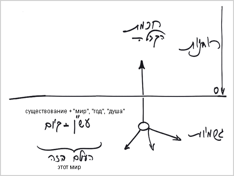 Причем под этим миром подразумевается «написанное в Торе» и наше понимание рассказанного в Торе относительно нас. Следовательно, это вовсе не восприятие моего животного тела, а то, что я представляю себе из рассказа Торы - «мир», «год», «душа», - в точке в сердце.