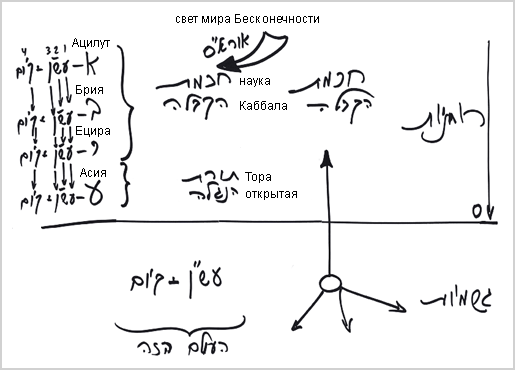 То есть наука Каббала – это Высший свет, который поступает из мира Бесконечности и облачается в миры Ацилут, Брия и Ецира. В отличие от этого, проявляемое в мире Асия называется открытой Торой.