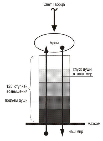 Начиная подниматься вверх, творение совершает свой путь по тем же 125 ступеням 5-ти миров, которые были созданы сверху вниз для этой цели. В результате подъема на очередную ступень творение получает от нее силы для перехода на следующую и т.д.