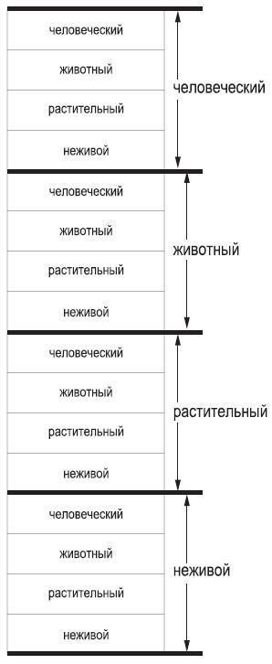 Все миры являются оттиском друг с друга по направлению сверху вниз, и все находящееся на уровнях неживой, растительный, животный и говорящий в мире Брия отпечатывается в мире Ецира. Соответственно, из уровней: неживой, растительный, животный и говорящий мира Ецира отпечатываются уровни: неживой, растительный, животный и говорящий мира Асия. Далее, неживой, растительный, животный и говорящий уровни мира Асия отпечатываются уровни: неживой, растительный, животный и говорящий – в этом мире.