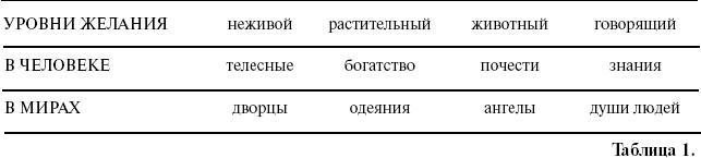 Первый и второй уровни человеческого желания получают и питаются от низших по отношению к ним уровней (неживого, растительного, животного). Третий уровень желания получает и наполняется от равных себе. Четвертый получает наслаждение и наполняет себя от высшего по отношению к нему уровня, то есть от сути мудрости и разума, представляющих собой духовные понятия.