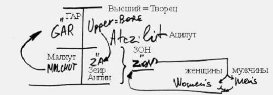 Позже мы с вами будем изучать миры, и узнаем, что в мире Ацилут есть ГАР – Высший, Творец, и низший – ЗА и Малхут. Света проходят к Малхут через ЗА, тем самым исправляют ее, и она достигает подобия Творцу. Все происходящее в мире Ацилут между ЗА и Малхут, вместе называемых ЗОН, происходит в нашем мире между всеми мужчинами и всеми женщинами.