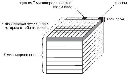 Чтобы понять это, вообразим себе куб, состоящий из семи миллиардов слоев – по числу жителей Земли. Каждый слой представляет одного человека и управляется им. В каждом слое имеется семь миллиардов ячеек. Одна из них – это «ты сам», а остальные символизируют других людей, которые в тебя включены. Так выстроена природой единая система. Суть в том, что каждый включает в себя всех, и потому все мы взаимосвязаны друг с другом.