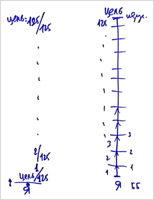 В материальном у меня первая ступень, вторая, третья и сто двадцать пятая – они разные. А в духовном – нет, в духовном я обязан тут же ориентироваться на цель, на своем самом маленьком уровне. У меня это будут 1/125, потом 2/125, пока я не достигну 125/125 ступени – это и станет окончательной целью.