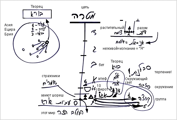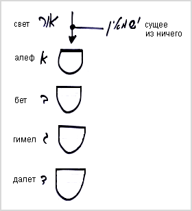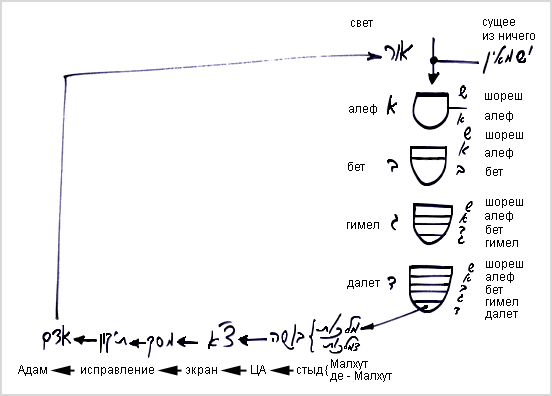 Сначала образуется стадия алеф, включающая в себя корневую стадию – шореш и саму стадию алеф. Затем развивается стадия бет, которая содержит внутри себя стадии: шореш, алеф и бет. Стадия гимел включает в себя стадии: шореш, алеф, бет и гимел. И в стадии далет уже содержатся все эти стадии: шореш, алеф, бет, гимел и далет.