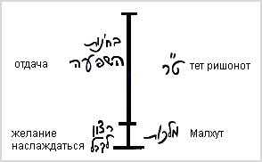 Из этого соотношения между Малхут и тет ришонот мы также можем увидеть, насколько Малхут зависима от тет ришонот, - в ней не может быть ничего своего. Ведь ей не присуще ни одно хорошее качество, кроме некоего побуждения, называемого «точкой в сердце», то есть сверхъестественного стремления достигнуть цели, которая состоит в том, чтобы уподобиться тет ришонот.