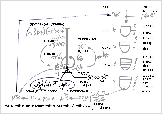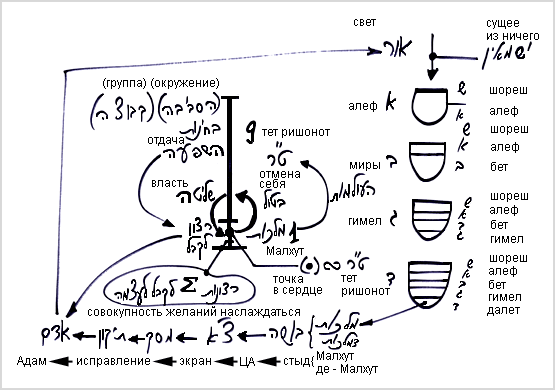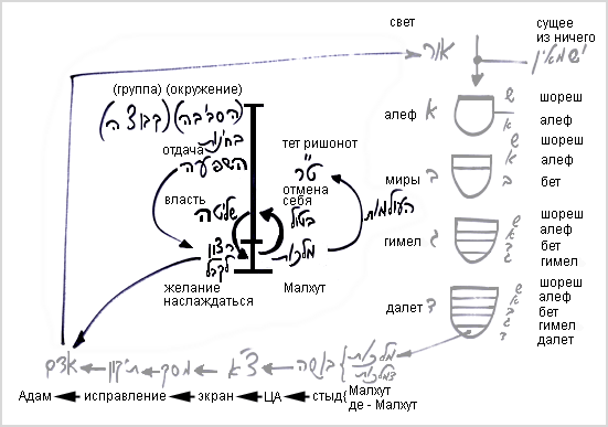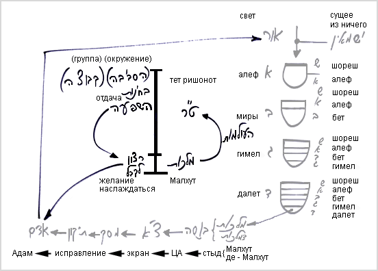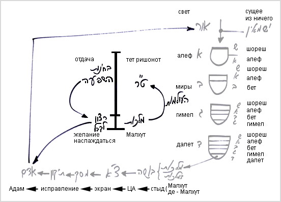 Мы учим, что распространение прямого света происходит по 4-м стадиям: алеф, бет, гимел и далет. В своем развитии каждая из этих стадий выстраивается из суммы света и желания еш ми айн (существующее из ничего), которое в нем заключено.