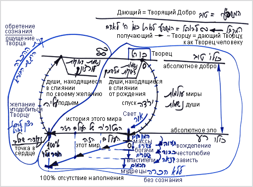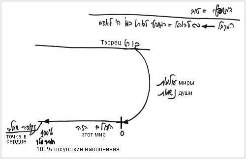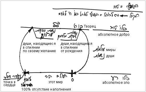 Внутри этой системы существуют души, которые приходят к самому худшему из возможных состояний, к состоянию, называемому этот мир. Здесь души развиваются от нулевого и до 100 процентного желания уровня этого мира. Тогда они начинают ощущать отсутствие наполнения, а вместе с тем ощущают точку в сердце, которая является точкой начала стремления к Творцу. Эта точка является частицей Творца свыше.