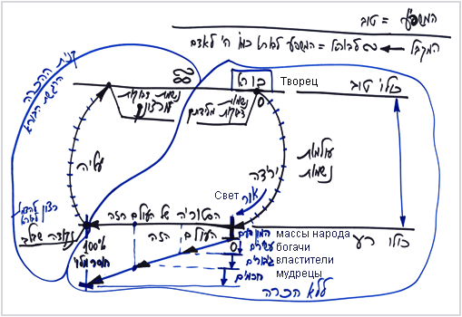 Это означает, что наверху есть Высший свет. Он действует на нас и пробуждает желание. И чем большее количество света воздействует на нас, тем больше развивается желание. Таким образом, свет проявляется в нас, как большее желание. Я рисую его внизу, потому что это эгоистическое желание.