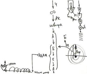 Далее. Откуда возникают миры, и откуда происходит Адам? Миры получаются следующим образом. Есть Малхут и перед ней - девять сфирот (они изображены кругами). И самое главное – надо исправить Малхут, которая ощущает себя творением. Для того чтобы исправить Малхут, мы должны вначале создать блок, который бы ее исправлял. Этот блок и является мирами Брия, Ецира, Асия. Следовательно, мирами называются девять сфирот, которые правильным образом проградуированы относительно Малхут - так, чтобы понимать и исправлять ее.