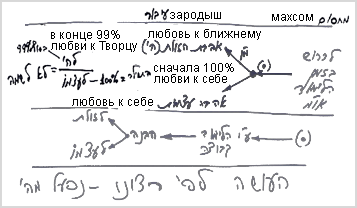 Причем, то, что на основе каждого намерения я строю себя в своем отношении к ближнему, не означает, что 613-ю заповедь - заповедь любви к ближнему, я выполняю только после того, как исполнил остальные 612 заповедей. Напротив, выполняя каждую из заповедей, я, в сущности, сотворяю себя в соответствии с правилом «возлюби ближнего как самого себя» с самого начала своего пути.
