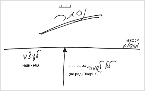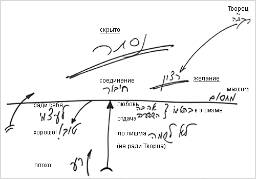 Мы учим, что со стороны нечистых сил, клипот (левой линии) существуют нечистые миры Асия, Ецира, Брия, Ацилут, Адам Кадмон и приходящие из них желания, а из правой стороны я беру силы, т.е. свет. И тогда я включаю в себя желание, приходящее от этого обновленного творения, и намерение, приходящее от света, со стороны Творца.