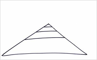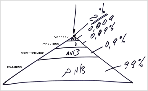 Я всегда привожу в пример соотношение неживого уровня материи с растительным, животным и человеческим. Это невозможно изобразить правильно, иначе вы не смогли бы увидеть в этой пирамиде уровень человека и внутри его – нас. Так же, как построена неживая, растительная, животная природа и человек, построена и пирамида рода человеческого. 99% не в состоянии воспринять эту идею, она не находится внутри них, это следствие соединения ГЭ и АХАПа. Только 0,9% могут как-то понять и присоединиться к нам, а 0,09% – принять какое-то участие. Человеческий уровень занимает в этой пирамиде 0,009%, а мы здесь на вершине почти сведены к нулю.