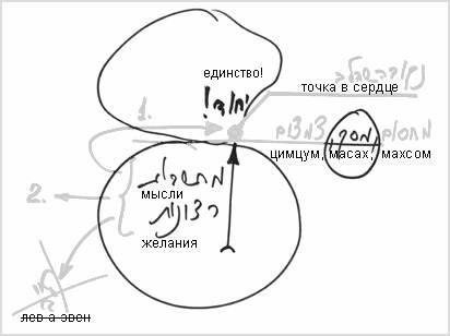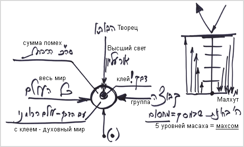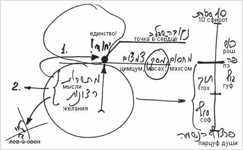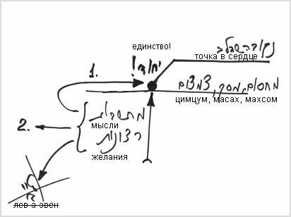 Прежде всего, я делаю цимцум (сокращение) на все, что ко мне приходит. Я сейчас присоединился к этой капле единства, и вот ко мне начинают приходить всевозможные помехи – мысли и желания. Прежде всего, я выставляю перед собой, между мной и помехами махсом (заградительный барьер), масах (экран), делаю цимцум (сокращение) – то есть какую-то преграду. И на этой границе я проверяю, сколько и какие из них я готов присоединить к этой точке единства, ведь она – это уже часть Божественного свыше, точка в сердце.
