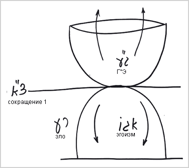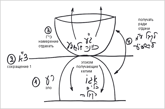 Изобразим эгоизм человека в виде горы, над которой в противовес желанию насладиться необходимо построить свойство отдачи, чтобы все желания приобрели намерение ради отдачи. Что же человек делает? Прежде всего, он осознает зло, находящееся в эгоизме. Затем он проходит через Сокращение, соглашаясь, насколько возможно, не использовать эгоизм. Это происходит медленно и постепенно, после чего человек приобретает отдающие келим, которые называются Гальгальта вэ-Эйнаим (ГЭ).