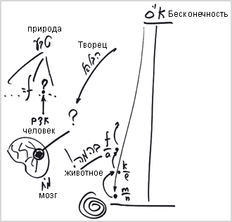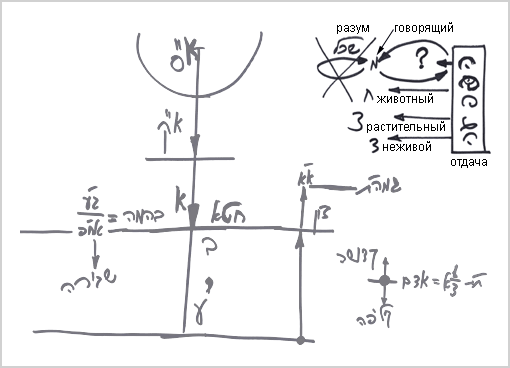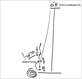 Он не помещает себя туда – он так устроен. Мы уже говорили, что средняя треть тифэрэт – это пустота, которую человек в себе обнаруживает. На чертеже № 12 мы изобразили ее в виде вопроса: человек обнаруживает в себе нечто такое, чего он не знает. А животное всегда знает, что делать в жизни, и у него нет проблем ни с пищей, ни с поведением в жару или холод. Животным руководят инстинкты, и все определяется природой.