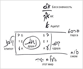 Все этапы спуска ступеней или подъема по ним человека от этого мира до Бесконечности можно разделить на две части: в действии и в замысле. Души всегда находятся в мирах БЕА (Брия, Ецира, Асия), а именно, посередине между БЕА дэ-клипот (эгоистическими) и БЕА дэ-кдуша (отдающими).
