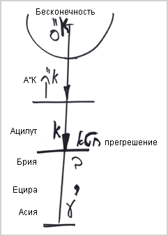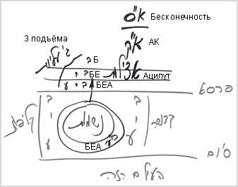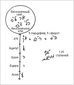 Как мы изучаем, в мире Бесконечности есть одно кли, наполненное одним светом. Мы изображаем это в виде круга, внутри которого есть весь бесконечный свет и бесконечное кли без ограничений. Оттуда начинается развитие кли согласно так называемой «линии меры», на которой располагаются пять миров: Адам Кадмон (АК), Ацилут, Брия, Ецира, Асия. Каждый мир состоит из пяти парцуфим, в каждом из которых есть пять (или десять, в зависимости от того, как считать) сфирот. Итого - 125 ступеней.