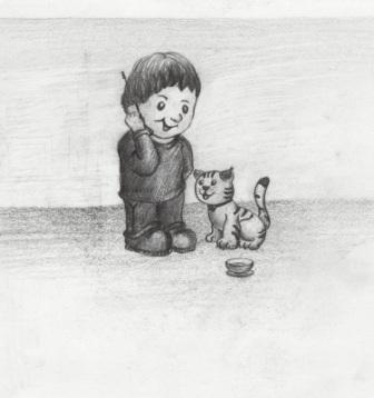 В это время наш герой услышал жалобное мяуканье котенка Васьки, который еще с утра ничего не ел. Мальчик достал из холодильника молоко и налил в Васькину миску. Котенок обрадовался и с удовольствием начал лакать молоко.