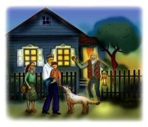 На улице уже было почти темно и очень тихо. Шурика понесли к какому-то домику с двумя светящимися окнами. Он увидел большую собаку, которая молча подошла к папе и начала его обнюхивать. Мама испуганно вскрикнула, собака громко залаяла, отворилась дверь домика, и на пороге появился старичок.