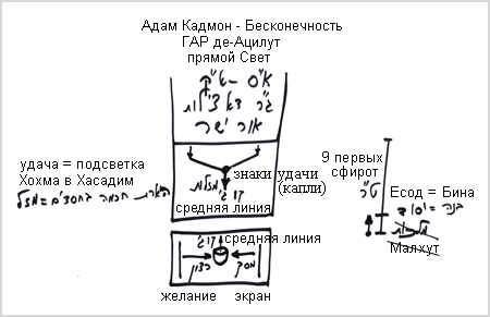 Есть высшая система, состоящая из мира Бесконечности, мира Адам Кадмон и ГАР дэ-Ацилут – это прямой свет. Этот свет может быть разделен на света и келим, главное, что в нем нет никаких ограничений. Понятие «свет» подразумевает свет хохма, ведь свет хасадим приходит снизу и означает исправления. В сочетании света хохма и хасадим, Аба и Има, строится средняя линия и свет поступает по каплям, которые называются «мазалот» (знаки удачи).