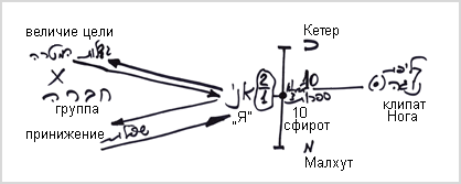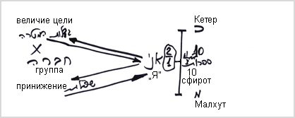 Выходит, что я получаю от общества величие цели и способность принизить себя в несколько раз большие, чем те, что существуют в моем первом решимо. Допустим мое первое решимо – 2/1 (я не хочу давать буквенное обозначение, чтобы не было путаницы). Я как бы увеличиваю это решимо до величины десяти сфирот.