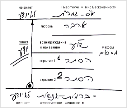 А проходит он ступени двойного и простого скрытия, переходит махсом, поднимается на ступень вознаграждения и наказания, ступень любви и достигает Конечного Исправления. И начинает он с уровня, на котором существует все человечество - с животного уровня. Здесь в нем пробуждается точка в сердце, с которой он начинает свое духовное возвышение. В начальной точке этого пути и в его конце он не может различить между добром и злом. Но проходя по его ступеням, он уже это знает, способен различить.