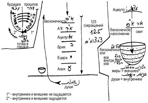 Существует одно кли, которое один раз получило бесконечное наполнение. Потом произошло Первое Сокращение, в результате которого наполнение исчезло. Затем это наполнение распространилось и приняло различные формы, которые называются мирами. В этих мирах из этого желания возникли дополнительные особенности и свойства, которые называются душами – в кли появились внутренние и внешние части. Все это произошло внутри одного кли.
