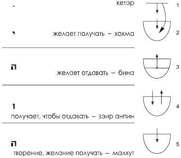 Предмет науки каббала – это «желание получать», то есть желание наслаждаться. Как уже было сказано, оно создается в пять этапов. Мы обозначаем эти этапы ивритскими буквами йуд-hэй-вав-hэй [1], а также названиями: кетэр, хохма, бина, зэир анпин и малхут.